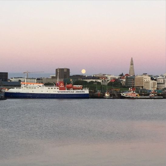 Moonrise and midnight sun. Reykjavik, Iceland.