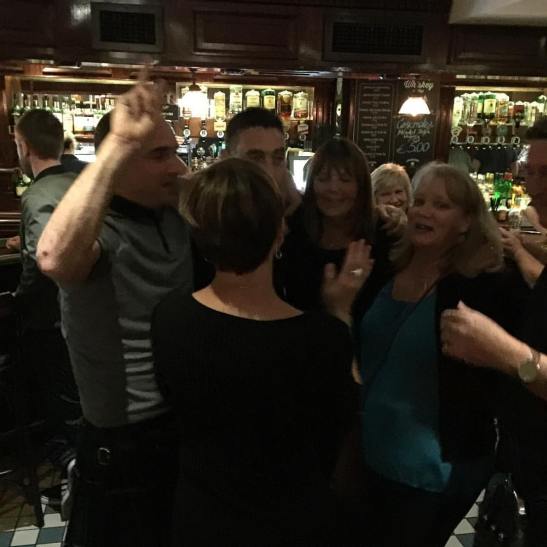 Sharing pints and dances with some of our fans – a group of people from Scotland (including men in kilts). (at O Donoghues Public House)